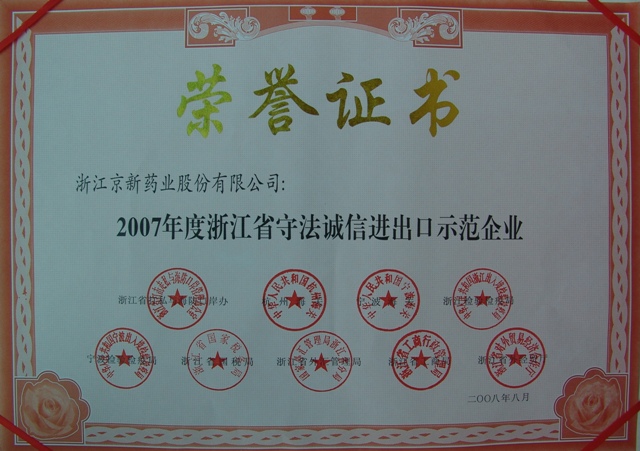 为树立遵法诚信收支口企业典范,,,,推进收支口企业诚信系统建设,,,,浙江省打私与海防口岸办、杭州海关、宁波海关、浙江磨练检疫局、宁波磨练检疫局、省国税局、省外汇治理局、省工商局、省外经贸厅联合在全省规模内开展了2007年度遵法诚信收支口树模企业推荐活动。。经各市打私办与有关职能部分派合推荐,,,,省级有关部分派合审核,,,,宣布了2007年度浙江省遵法诚信收支口树模企业,,,,我公司榜上著名。。