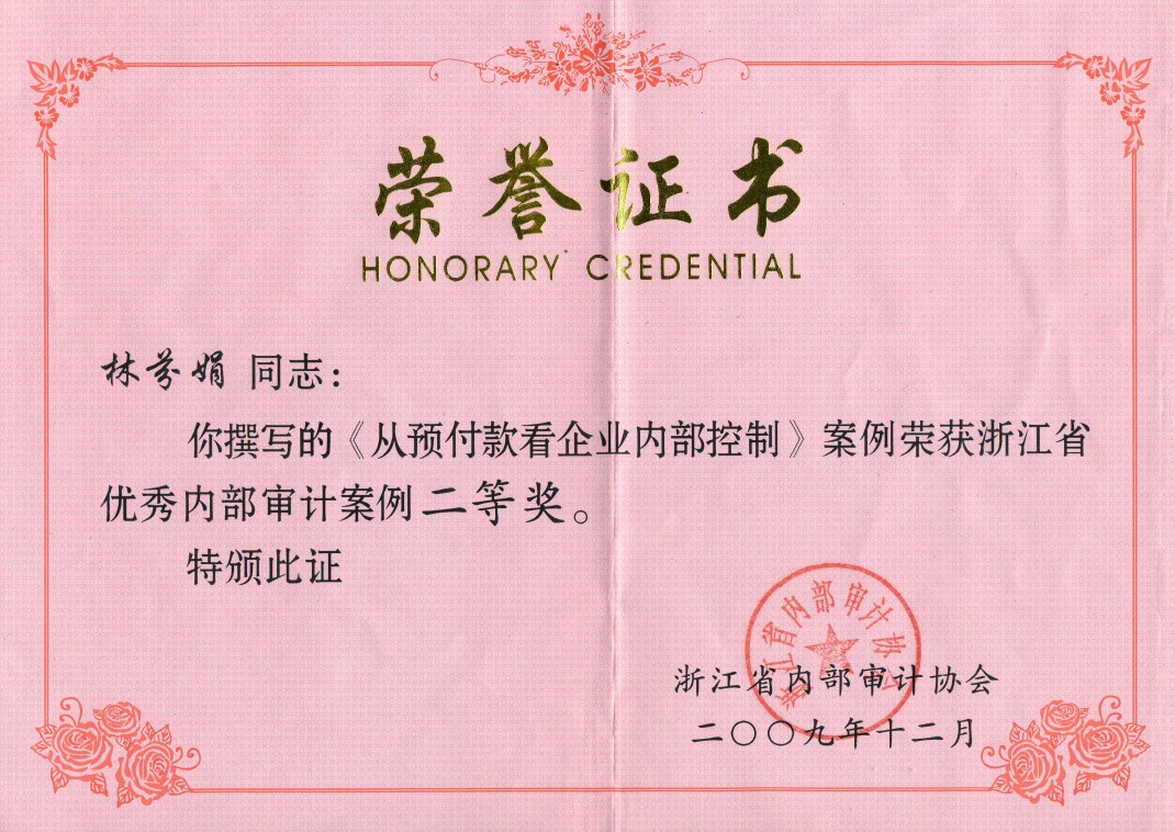 克日,,,,,,从绍兴市内部审计师协会传来喜讯,,,,,,审计部选送的《由一件工程舞弊案件引发的思索》荣获浙江省内审案例评选二等奖、市内审案例评选一等奖。。。。同时,,,,,,转达还表扬了2009年度优异内审项目,,,,,,审计部的《2009年1-7月药品销售公司退货情形审计》项目获得市内审项目二等奖。。。。之前,,,,,,审计部司理林芬娟撰写的《从应收款看企业内部控制》一文,,,,,,也一经获得过浙江省内部审计案例二等奖。。。。